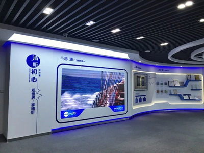 展廳大門一側(cè),在高分辨率液晶顯示屏構(gòu)成的超大屏幕上,滾動(dòng)播放著企業(yè)宣傳片,參觀者還未進(jìn)入展廳便可了解到企業(yè)的基本情況,企業(yè)愿景、價(jià)值觀、發(fā)展情況和智慧團(tuán)隊(duì)。