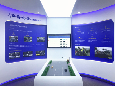 通過(guò)觸摸屏播放視頻講解聚音寶,以模型展現(xiàn)智慧文體產(chǎn)品型號(hào),觸摸屏展示其應(yīng)用案例。在鳴笛抓拍系統(tǒng)展區(qū),采用微縮道路模型+顯示屏,還原應(yīng)用現(xiàn)場(chǎng)。通過(guò)觸摸屏介紹驅(qū)逐者系統(tǒng)及其行業(yè)應(yīng)用。