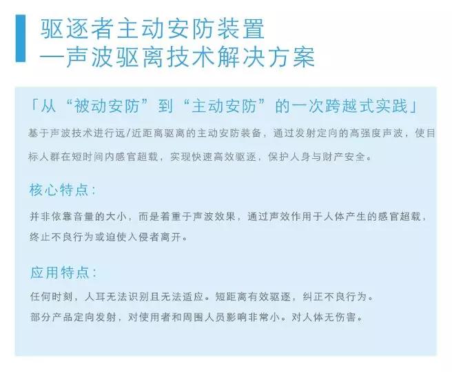 驅逐者主動安防裝置可根據客戶環境構建制定與之匹配的解決方案,通過多合一構造,一臺設備上整合了抗干擾強、發出強驅離性聲波、易安裝等特點。