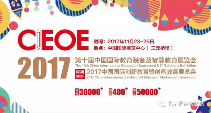 2017年11月23日至25日,第十屆中國國際教育裝備及智慧教育展覽會將在北京中國國際展覽中心舉辦,屆時會有400+國內(nèi)外展商展出包含教育信息化、智慧校園、創(chuàng)客教育、在線教育、校園新風(fēng)等相關(guān)產(chǎn)品、技術(shù)及解決方案。