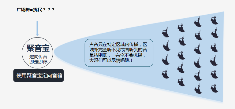 辦法六:使用專門的防干擾音響。使用傳說中的”廣場舞神器“——聚音寶定向音響, 這種音響能把聲音集中在一個特定的區(qū)域內(nèi),在區(qū)域內(nèi)的人能聽見聲音,區(qū)域為則聽不見,或者聲音音量很低。這樣既不會產(chǎn)生噪音,又不影響舞者積極性,達到了強身健體不擾民的雙重目的。