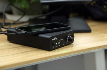 功放盒子,采用金屬機(jī)身,配合黑色噴砂陽(yáng)極氧化工藝,品質(zhì)感十足,前面有電源鍵、指示燈、Audio in接口(音頻線和USB數(shù)據(jù)線均可接入)、音量旋鈕;后面是電源接口和Audio輸出接口;底部四個(gè)角各有1個(gè)防滑硅膠墊。