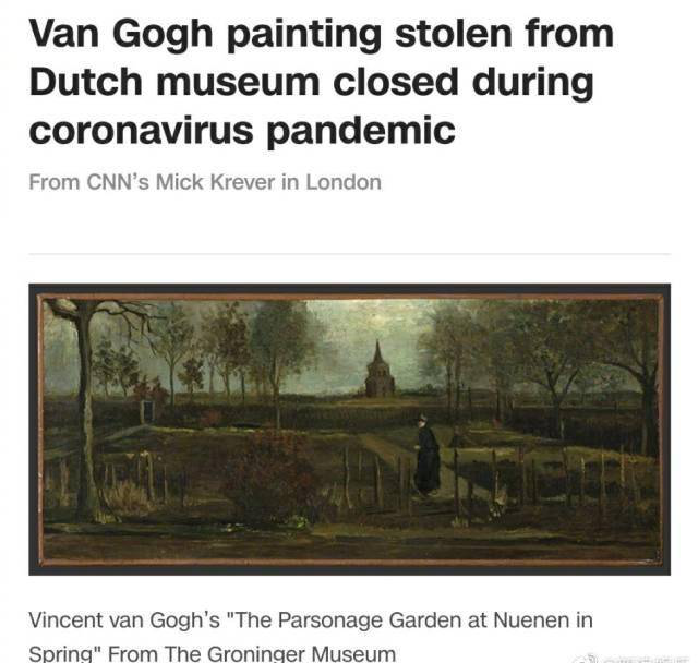 據美聯社、英國每日快報等多家媒體報道,3月30日凌晨,位于荷蘭阿姆斯特丹東部的辛格·拉倫博物館夜間遭盜賊闖入,正在展出的梵高畫作《春天花園》被盜。據悉,這件作品是該館從荷蘭北部城市格羅寧根的格羅寧格博物館借展的。作品創作于1884年,畫的是荷蘭小鎮紐南的鄉村風景。據一位藝術家透露,這副畫作的價值可能高達600萬歐元。