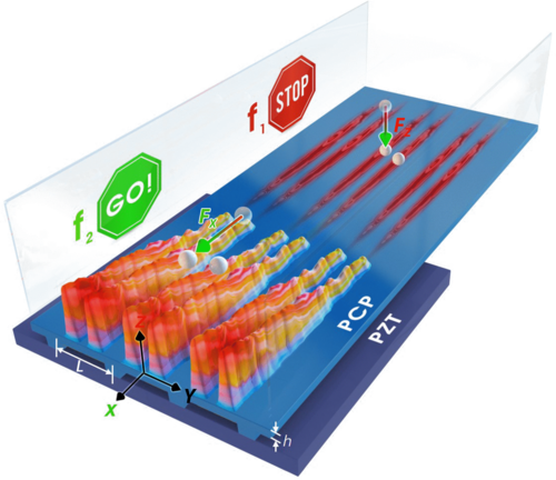 通過(guò)切換頻率以改變聲子晶片的諧振模式以及通過(guò)在聲子晶片上設(shè)計(jì)圖案以構(gòu)建路線,實(shí)現(xiàn)了沿通道中預(yù)定路徑的粒子和細(xì)胞的任意走走停停運(yùn)動(dòng),即捕獲和傳輸。通過(guò)在微流控設(shè)備中使用聲子晶體或超材料仔細(xì)設(shè)計(jì)和設(shè)計(jì)聲場(chǎng),可以在生物醫(yī)學(xué)應(yīng)用中以可調(diào)和多功能的方式對(duì)各種材料、粒子、細(xì)胞和生物體進(jìn)行聲學(xué)操作。在各種應(yīng)用中,使用可實(shí)時(shí)調(diào)諧和調(diào)整的聲輻射力對(duì)粒子和細(xì)胞進(jìn)行非接觸式操縱已變得非常重要。